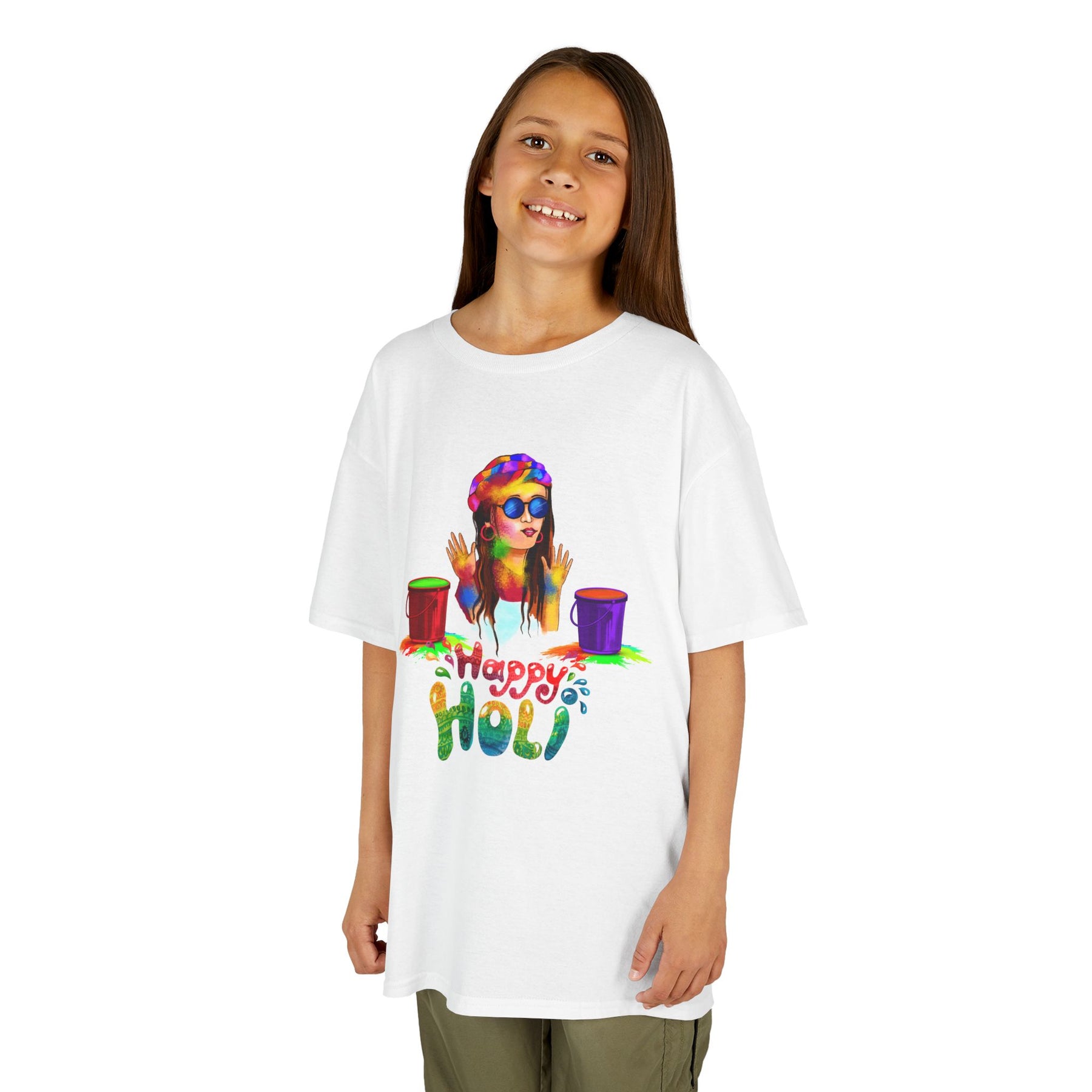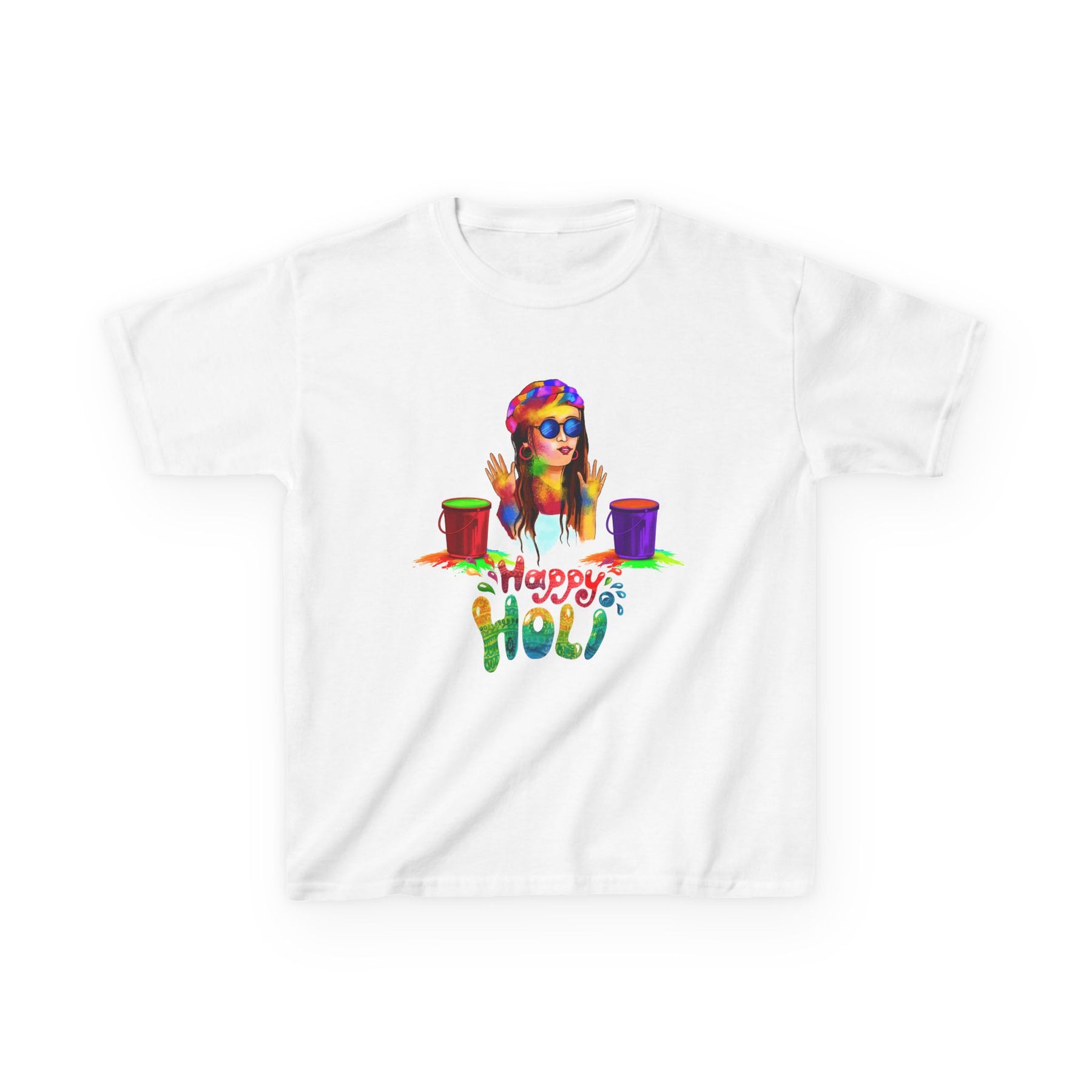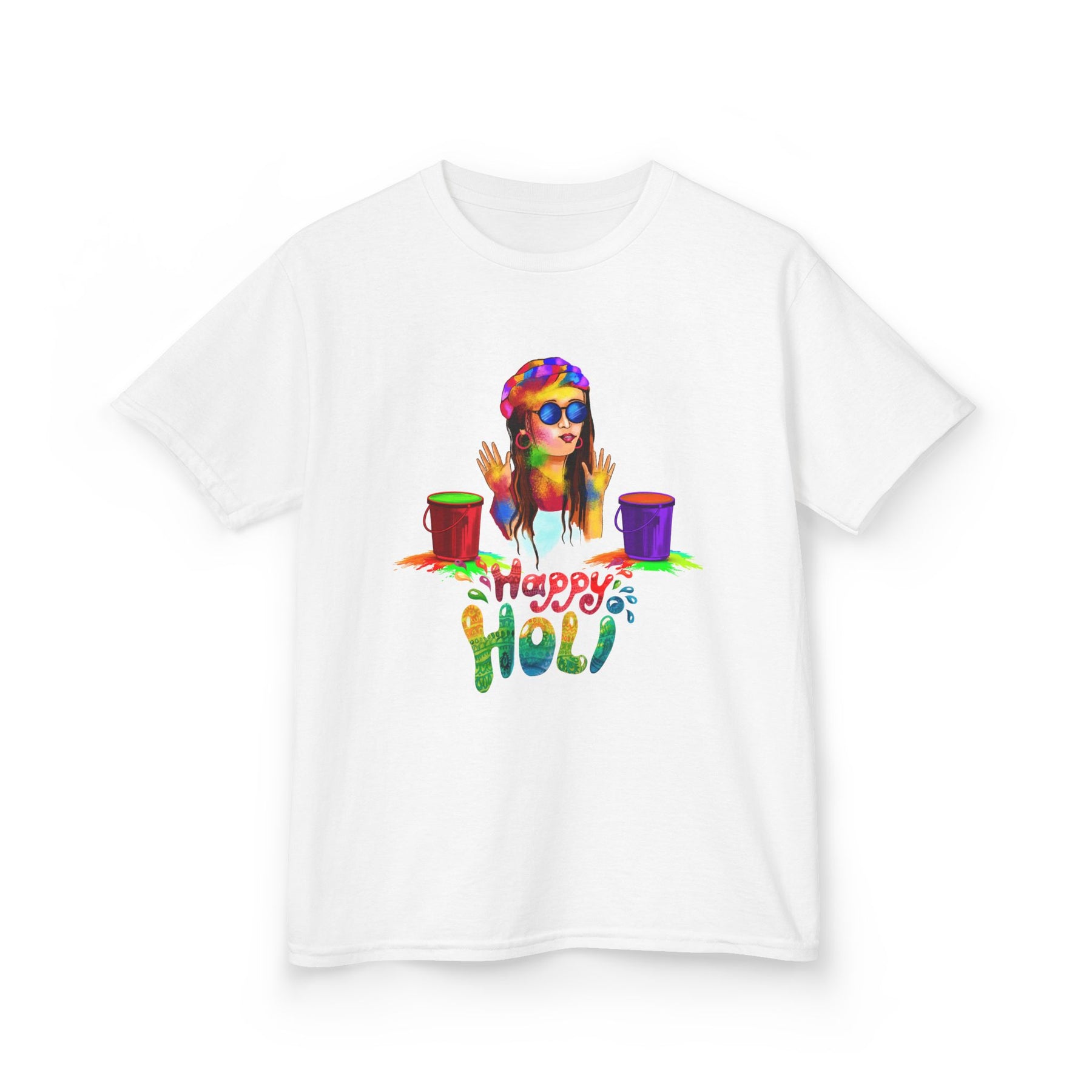 Bright, playful, and made for little ones who love color. This kids tee features a lively Holi-inspired illustration of a smiling child with colorful powder and paint buckets, with "Happy Holi" hand-lettered beneath. The midweight, 100% US cotton fabric feels soft against the skin and holds vibrant prints well, so the artwork stays bold wash after wash. The classic crew neckline and relaxed, timeless fit let kids move freely while celebrating festivals, family gatherings, or everyday play. Thoughtfully constructed details — like a ribbed collar, shoulder tape for stability, and tear-away labels for itch-free comfort — make it practical as well as joyful. Ethically sourced cotton and REACH/Oeko-Tex certifications add extra peace of mind.